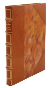 Paris, Pour les Cent Bibliophiles, 1918 ; in-4 demi-maroquin havane à coins, dos à nerfs orné de multiples filets dorés, tête dorée, couverture illustrée en couleurs (Canape).Splendide typographie en noir et havane, un portrait et des vignettes gravées sur bois par Le Meilleur.