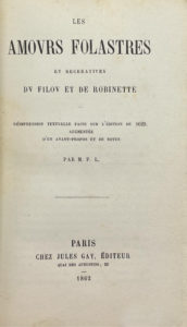 Les Amours folastres et récréatives du Filou et de Robinette. Paris, Jules Gay, 1862 ; in-12, demi-maroquin noisette à coins (V. Champs).