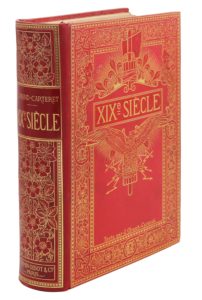 GRAND-CARTERET John. XIXe siècle en France. Costumes, inventions.Paris, Firmin-Didot, 1893 ; grand in-8, demi-chagrin rouge, reliure entièrement décorée de l’éditeur. 17 planches en couleurs et près de 500 gravures.