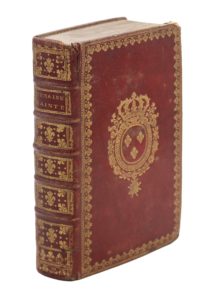 Office de la Semaine sainte. Paris, Hérissant, 1726 ; in-8, maroquin rouge de l'époque, roulette dorée et fleurons aux angles, armoiries au centre, dos orné, dentelle intérieure, tranches dorées. Titre gravé orné d'un portrait de la jeune reine Marie Leszczynska, à qui l'édition est dédiée. Exemplaire aux armes royales de Marie Leszczynska. Reliure usée, quelques taches et rousseurs éparses.