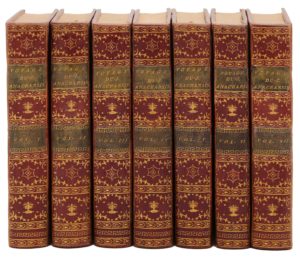 Paris, (Imprimerie de) Didot Jeune, an VII (1798). 7 vol. in-8 (195 x 122 mm) et un atlas in-4 (270 x 198 mm). Maroquin rouge, dos lisses ornés, tranches dorées (Reliures de l’époque).39 cartes, plans et vues à double page ou repliés.