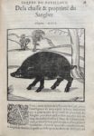 ÉDITION ILLUSTRÉE DE 88 BOIS GRAVÉS, qui reste « fort recherchée à cause de l'avantage des augmentations qu'elle renferme, et parce que le tirage des gravures est meilleur que celui des éditions postérieures » (Thiebaud). La Venerie est illustrée de 57 figures – dont les trois remarquables bois aux animaux « noirs » du chien et des sangliers, certaines à pleine page (la remise du livre au roi, les banquets de chasse). La Fauconnerie est illustrée de 31 figures d’oiseaux, certaines directement empruntées à l'Histoire de la nature des oyseaux de Belon. Vignette inédite gravée sur les titres : un veneur et un fauconnier s'exerçant dans la campagne. Musique notée, notamment dans les charmantes planches des bergères.