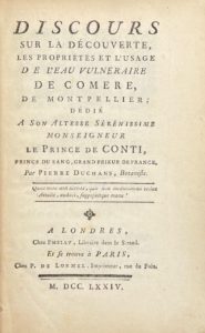 DUCHANS (Pierre) — Discours sur la découverte, les propriétés et l'usage de l'eau vulnéraire de Comère, de Montpellier.