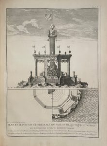 Paris, Lemercier, 1740. Grand in-folio (623 x 460 mm), maroquin rouge, roulette dorée autour des plats, armes au centre, fleur de lys aux angles, dos à dix nerfs orné de fleurs de lys, tranches dorées (Reliure de l’époque).Fleuron sur le titre de Bouchardon gravé par Soubeyran, 13 planches ou plans dont 8 doubles dessinés par Blondel, Gabriel, Salley et Servandoni, gravés par Blondel, et 22 pages de texte avec une grande vignette de Rigaud. La plus célèbre de ces planches est celle du Feu d’artifice donné sur la Seine.