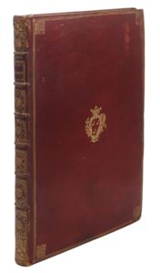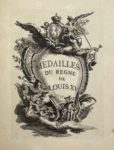 Paris, s.d. (1748). In-folio (330 x 246 mm). Maroquin rouge, fleurons dorés aux angles des plats, armes au centre, dos à nerfs orné, tranches dorées (Reliure début XVIIIe).Frontispice de Lemoine gravé par Cars, titre, dédicace et 78 planches de médailles. Un feuillet manuscrit à la fin du volume, contenant la liste des médailles qu’on pourrait frapper a posteriori.