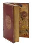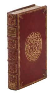 Paris, Desprez et Desessartz, 1717. In-12 (157 x 94 mm). Maroquin rouge, dos orné aux petits fers, roulette dorée sur les plats, petits fleurons aux angles, armes au centre, doublures et gardes de papier doré à décor floral polychrome, tranches dorées sur marbrure (Reliure de l’époque).TRÈS JOLIE RELIURE, DOUBLÉE D’UN RAVISSANT PAPIER D’AUGSBOURG.