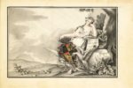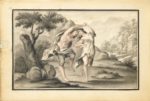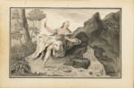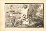 TRIO : Dessin 8, en face de la p. 177, daté 1722. Deux amoureux peu vêtus étendus sur une toile posée sur l’herbe. Accessoires et personnages à l’antique (vase, colonne carrée surmontée d’un pot cassé dont la jeune femme tient un fragment, faune renversant son bâton, Cupidon (ou plutôt l’Hymen) s’envolant vers un groupe de 4 amours (l’Instant désiré…).