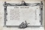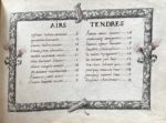 Les Tables des différentes sections occupent 5 feuillets à la fin du volume, chacune dans un encadrement et avec des ornements différents appropriés au sujet (arc de Cupidon et torches, cortège d’amours bachiques, chien et accessoires de bergers, un couple d’amoureux dont la femme joue de la guitare baroque à 5 cordes - l’instrument favori de Louis XIV). La première Table, Airs tendres, est signée V[alory] inv. et Pinx.