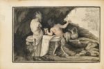 AIRS BACHIQUES : Dessin 3, en face de la page 21, daté 1721. Un satyre-terme et Pan couché partagent des libations dans un décor de caverne, de part et d’autre d’une banquette. Une flûte sur la banquette et une flûte de Pan à terre.