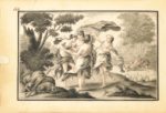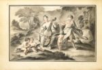 PASTORALES : Dessin 6, p. 144, daté 1723. Une ronde de trois bergères et un berger, leur chien et leurs attributs de bergers sous un arbre, dans un paysage de bois et de prairies. Le troupeau de moutons observe un couple d’amoureux au fond à droite. Petite déchirure d’1 cm dans la marge supérieure.