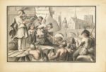 VAUDEVILLES : Dessin 9, placé en face de la p. 193, avec le titre Chansons nouvelles et la date 1723 dans un cartouche. Un violoniste sur des tréteaux devant la statue équestre de Henri IV sur le Pont-Neuf est accompagné d’un jeune chanteur et d’un couple distribuant des vaudevilles ou des chansons satyriques au public. Dans le fond le palais de la Cité, la Sainte-Chapelle (?) et Notre-Dame. Ballard publie à Paris en 1717 La Clef des Chansonniers, ou Recueil des Vaudevilles depuis 100 ans et plus, notez et recueillis pour la premiere fois, qui contient plus de 300 vaudevilles.