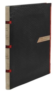 Paris, Les Nourritures terrestres, 1947. In-folio (335 x 252 mm), plats de rim moulé, noir et bordé rouge, pièce de veau crème sur le 1er plat, dos de veau crème, titré à l'œser rouge,même titrage au dos, à l'œser noir (Jean de Gonet Artefacts).Texte clandestin d'Éluard publié à Alger en 1942, « traduit et diffusé dans toute l'Europe, sous le manteau, par radio, par parachutage... »