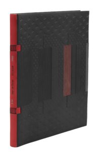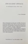 Jean de Gonet Artefacts : exposition du 7 au 30 octobre 1987. Paris : Impr. Union Paris, 1987. 19 cm. Étui et emboîtage de toile beige titré en bleu. Illustrations en couleur. En accordéon, sous reliure spéciale de l’artiste. L’un des 50 exemplaires de luxe, numéroté 44/50.