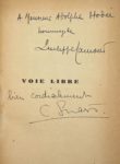 Envois autographes signés des trois auteurs (une carte pour Bousquet, « absent de Paris »), à Adolphe Hodée (1888-1969), spécialiste de l’horticulture et des jardins, secrétaire de la Fédération des Agriculteurs, auteur en 1935 auprès du Conseil supérieur du Travail d’un rapport qui fut immédiatement suivi d’effet sur « Les Vacances payées ». Ex-libris de Hodée avec sa devise, Doute mais agis.
