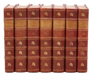 Paris, De Bure l'aîné, 1789-1790. 7 volumes in-8 et un atlas in-4, maroquin rouge, double filet, faisceau de licteur doré au centre, bonnets phrygiens aux angles et au dos, tranches jonquille (Reliure de l'époque).Seconde édition de ce célèbre ouvrage.