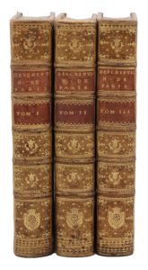 Paris, Martinet, Valace, 1780-1781. 3 volumes in-4, maroquin vert, filet doré en encadrement, dos orné d'armoiries, pièces de titres et tomaison rouge (Reliure de l'époque).Exemplaire composé du premier volume de la Description historique de Paris par Martinet et des tomes premier et troisième de l'Histoire de Paris.
