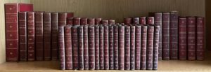 [RELIURES EN MAROQUIN ROUGE] — Ensemble 12 ouvrages en 44 volumes reliés en maroquin rouge du XVIIIe siècle, dans le goût de Derome pour la plupart.