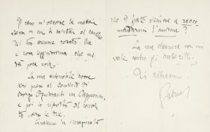 Manoscritto autografo a penna nera. 1 bifolio (scritte 3 pagine). Carta con intestazione Per non dormire. Carta con filigrana.