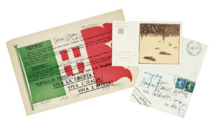 1 cartolina postale commemorativa del Volo su Vienna (1918), con immagine in beige e marrone, ed. Arti Grafiche G. Zanetti Milano ; 1 copia anastatica del volantino tricolore lanciato su Vienna con le firme dei partecipanti all'impresa (testo in italiano) ;