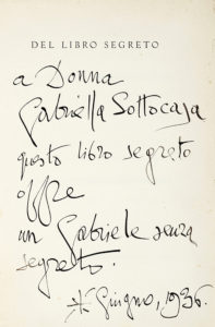 Esemplare dedicato alla contessa Gabriella Levi Sottocasa : A Donna / Gabriella Sottocasa / questo libro segreto / offre / un Gabriele senza / segreto / giugno, 1936.