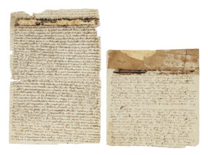 Manoscritto a inchiostro nero. Un bifolio, quattro pagine densamente scritte in francese. Minime lacune che non toccano il testo.