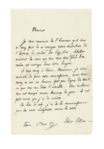 PELLICO Silvio, Lettera autografa firmata, inviata a [René-Charles-Hippolyte Le Prestre] Marquis de Chateaugiron, pair de France. — Datata 1 maggio 1837, Torino.
