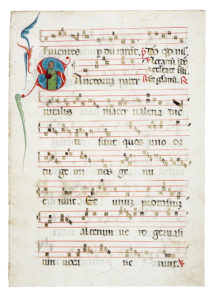 Manoscritto a inchiostro bruno e rosso su pergamena con notazione musicale su quattro linee.