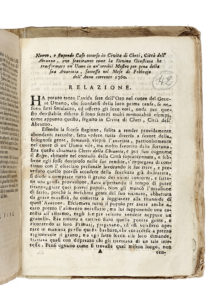 La miscellanea contiene : Risposta alla scrittura intitolata : Motivi delle risoluzioni del Re. Vienna, Pietro Schmalz 1733 – Osservazioni sopra li motivi delle risoluzioni del Re Cristanissimo. S.a – Raggiaglio della vita del glorioso martire S. Pantaleone medico di Nicomedia [...]. Lucca, Cappurri 1718 – Delle lodi del glorioso Patriarca San Benedetto [...]. Padova, Fratelli Sardi 1628 – Panegirico in lode di S. Luigi Gonzaga [...]. Lucca, Marescandoli 1749 – Vita d'Innocenzo Undecimo [...] decritta da Gio : Battista Pittoni [...]. Venezia Pittoni 1716 – Breve notizia della vita del Sommo Pontefice Innocenzo XI (testo manoscritto) XVIII secolo – Copia dell'elogio posto dentro la cassa di Benedetto Labre. Roma 1783 – Horatio habita in seminario lucensi [...]. Olisipone, Marescalium 1768 – Orazione funebre nell'esequie del [...] Cardinale Orazio Filippo Spada [...] Lucca, Ciuffetti 1724 (2 copie non in successione) – Memorie della vita di Domenico Martinelli [...]. Lucca, Rocchi 1772 – Orazione funebre recitata in Breslavia nei funerali di Lorenzo Ricci ultimo Generale della Compagnia del Gesù [...] 1776 – Orazione panegirica in lode di S. Francesco Zaverio [...]. Lucca, Cappuri 1747 (2 copie non in successione) – Orazione panegirica in lode di S. Francesco di Sales [...]. Lucca, Rocchi 1781 – Atti della solenne coronazione di [...] Bernardino Perfetti [...]. Lucca Marescandoli [1725] – Il martire d'amore. Panegirico di S. Angelo Mart Carmelitano [...]. Lucca, Marescandoli 1697 – Orazione panegirica del Volto Santo di Lucca [...]. Lucca, Marescandoli e Pozzotorelli 1737 – Dell'Evangelica ragion di Stato. Orazione [...]. Lucca, Ciuffetti 1725 – Panegirico di S. Filippo Neri [...]. Lucca, Cappuru 1735 – Oratio paraenetica ad novos philosophiae auditores [...]. Florentia 1779 – Elogio funebre della S.R.M. di Maria Teresa d'Austria [...]. Lucca, Bonsignori 1781 – Nelle solenni esequie rese in Pietrasanta [...] di Maria Teresa imperatrice [...]. Lucca, Marescandoi s.a. – Vita di Jacopo Vignali pittor fiorentino. Firenze, Paperini 1753 – Vita di Antonio Franchi lucchese pittor fiorentino [...]. Firenze Albizzini 1754 – Orazione funebre nelle solenni esequie di [...] Francesco primo [...]. Lucca Benedini 1765 – Rappresentazione e festa di Rosana. Pistoia s.a. – Dissertatio historico-Epistolaris [...]. Lucae Salani 1754 – Ponderazione d'uno spagnuolo militare sotto gli stendardi di Carlo III. 1704 – Thomae Nesti pistoriensis [...]. Lucae, Rocchium 1780 – Testo senza frontespizio. L'incipit è : Lucrezia Belloni di Pisa, dell'età di 27 anni e di temperamento vigoroso [testo di argomento medico] – Relazione dell'orribil flagello seguito nella Calabria e in Messina per cagione de i gran terremoti 1783 – Distinta relazione della terribile giustizia seguita in Parigi li 28 marzo 1757 [...]. Pisa, Giovannelli 1757 – Aggiunta al n. 26 della Gazzetta Patria 1766 – Copia di una lettera scritta in idioma arabo da Mahamet Bey di Sufa [...] al Gran Maestro di Malta [...]. Firenze 1737 – Nuova e distinta relazione della presa di una Galeotta Tripolina [...]. s.a. – Grazia ricevuta dal glorioso S. Antonio di Padova l'anno 1757 [..]. In Milano s.a. (2 esemplari) – Relazione della morte data in Algeri [...] al Padre Pietro Rainalduccio [...]. Roma e Lucca Benedini 1767 – Nuovo e stupendo caso occorso in Civita di Cheti [...] ove sentiranno come la Divina Giustizia ha trasformato un Uomo in un'orribili mostro [...]. Napoli 1760 – Nuova vera e distinta relazione [...] del successo seguito a Cadice da un mercante [...]. Lucca, Benedini 1751 – Relazione dell'atrocissimo caso seguito nelle vicinanze di Livorno [...] 1754 in cui furono barbaramente privati di vita marito e moglie [...]. Livorno e Lucca, Benedini 1755 – Distinta relazione [...] nella città di Lisbona [...] contro lì principali congiurati [...] che tentarono di uccidere Sua Maestà Portoghese [...]. Mantova e Piacenza 1759 – Relazione della scoperta recentemente fatta [...] di un'isola alla quale ha dato il nome di Nuova Citera. Roma 1749 – Bando e sentenza degl'illustrissimi esecutori contro la bestemmia [...]. Venezia, S. Marco 1754 – Vera e distinta relazione dell'incendio [...] del 1749 nel famosissimo tempio di S. Antonio da Padova [...]. Padova, Giuntini 1749 – Copia di lettera scritta a Monsig. Acquaviva d'Aragona Commissario Generale del Mare dal Cav. Pollastron [...] 1755 – Vero e sicuro ragguaglio dell'apparso fuoco spaventoso in aria a Milano [...] 1737 – De vasorum Humani corporis sistemate [...] Lucae, Marescandoli 1750.