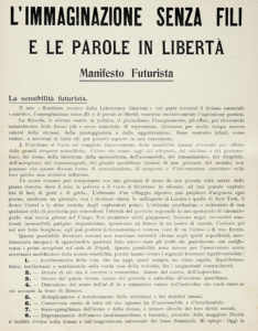 MARINETTI Filippo Tommaso, L’immaginazione senza fili e le parole in libertà. — Milano : Direzione del Movimento Futurista (Tip. A. Taveggia), 11 maggio 1913. — In-4° (mm 290x230).
