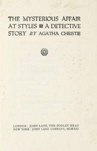 CHRISTIE Agatha, The Mysterious Affair at Styles. — A detective story. — London : John Lane, 1921. — In-8° (mm 185x120).