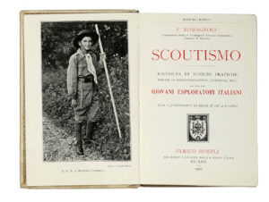 ROMAGNOLI Ferdinando, Scoutismo. — Raccolta di nozioni pratiche, norme di organizzazione, consigli [...] ad uso dei giovani esploratori italiani... — Milano : Ulrico Hoepli, 1916. — In-16° (mm 146x100).