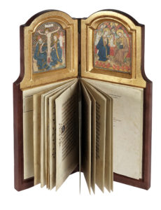 contenente : 1 volume di Commentario in-8° (mm 210x138) e il facsimile del Codice 1800 della Biblioteca Nazionale d'Austria, riprodotto in fotolitografia a colori (con le iniziali e le miniature impreziosite con foglia d'oro dal laboratorio grafico Heinz Deuschle di Göppingen) e conservato in una custodia a forma di una pala d'altare da viaggio in legno, rivestita in vacchetta marrone (mm 352x155), insieme ad un dittico decorato con le riproduzioni delle immagini religiose dell'originale. Il tutto perfettamente conservato. Uno delle 980 copie in numeri arabi, su una tiratura complessiva di 1060 copie. (2) Riproduzione facsimilare del manoscritto miniato conservato, con il codice Codex 1800, presso la Österreichischen Nationalbibliothek di Vienna.