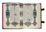 Ricchissima riproduzione a colori del codice originale, in sontuosa legatura editoriale in velluto rosso su piatti in legno, con inserti in argento dorato al piatto anteriore e fermagli di chiusura.