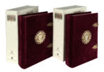 Ciascuno avvolto in stoffa ricamata, entro cofanetto editoriale in cartone decorato. Presenti i due volumi di commentario, in custodia editoriale.
