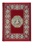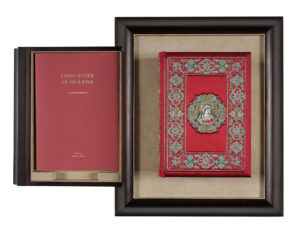 Sontuosa legatura editoriale in seta rossa ricamata sui piatti e sul dorso a fili d'oro, d'argento e sete colorate ; al centro del piatto anteriore il volto della Vergine Maria, mentre in quello posteriore lo stemma del possessore. Tagli goffrati e dorati. Presenti il cofanetto-teca in plexiglass e la base in legno ; quest'ultimo conserva all'interno di un cassettino il volume di Commentario, in italiano, e il Certificato di garanzia. Tiratura in 499 esemplari numerati (1)