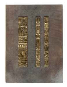 Esemplare lievemente e uniformemente brunito, con rare macchioline, ma ottimo stato complessivo. Cartella editoriale in cartonato decorato con tre bassorilievi in bronzo dorato di Arnaldo Pomodoro, leggermente scolorita ; il tutto contenuto entro astuccio in legno e tela con grande incisione in ottone applicata al piatto anteriore.