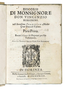 BORGHINI Vincenzo, Discorsi [...]. — Al serenissimo Francesco Medici gran duca di Toscana. — Parte prima (-seconda). — Recati à luce da' deputati per suo testamento. — In Fiorenza : nella stamperia di Filippo, e Iacopo Giunti, e fratelli,...
