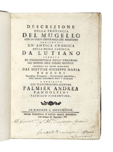 BROCCHI Giuseppe Maria, Descrizione della provincia del Mugello con la carta geografica del medesimo... — In Firenze : nella stamperia d'Anton Maria Albizzini, 1748. — 2 parti in 1 volume in-4° (mm 235x175).