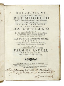 BROCCHI Giuseppe Maria, Descrizione della provincia del Mugello con la carta geografica del medesimo... — In Firenze : nella stamperia d'Anton Maria Albizzini, 1748. — 2 parti in 1 volume in-4° (mm 228x170).