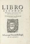 CORTE DEI MERCANTI (Lucca), Li Statuti de la Corte de mercadanti de la magnifica citta di Lucca. — In Lucca : per Vincenti Busdraghi, 1557 (1581). — In-folio (mm 297x197), in 4 parti, ciascuna con il proprio frontespizio.