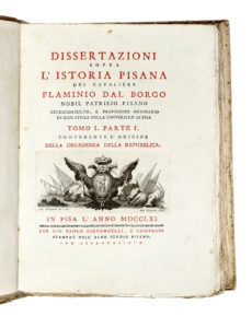 DAL BORGO Flaminio, Dissertazioni sopra l'istoria pisana [...]. — Tomo I. Parte I (-II).— In Pisa : per Gio. Paolo Giovannelli, 1761-1768. — 2 volumi in-4° (mm 270x200).