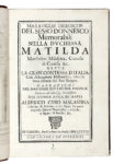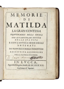 FIORENTINI Francesco Maria, Memorie di Matilda la Gran Contessa propugnacolo della chiesa con le particolari notitie della sua vita e con l'antica serie degli antenati... — In Lucca : appresso Pellegrino Bidelli, 1642. — In-4° (mm 200x150).