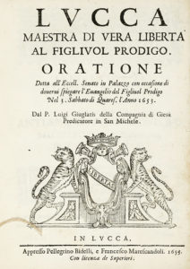 GIUGLARIS Luigi, Lucca maestra di vera libertà al figliuol prodigo. — Oratione detta all'Eccell. senato in Palazzo [...] Nel 3. Sabbato di Quares. l'Anno 1653. — In Lucca : appresso Pellegrino Bidelli, e Francesco Marescandoli, 1653. — In-4°...