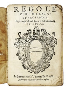 GUIDICCIONI Alessandro, Regole per le classi de' sacerdoti, et per ogn'altro chierico della diocesi di Lucca. — In Lucca : appresso Vincenzo Busdraghi a stanza di Ottauiano Guidoboni, 1580. — In-8° piccolo (mm 145x95).
