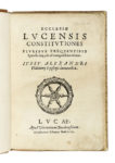 [SI AGGIUNGE :] Guidiccioni Alessandro, Ecclesiae Lucensis constitutiones pluribus frequentibus Synodis latę, et ad compendium relatae... Lucae : apud Vincentium Busdraghium ad instantiam Octauiani Guidobonij, s.d. [1594]. In-4° (mm 204x145). Pagine : [8], 183, [9]. Testo in corsivo con belle iniziali xilografiche con decorazioni tipografiche.