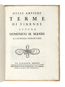 MANNI Domenico Maria, Delle antiche terme di Firenze. — In Firenze : nella stamperia di Gio. Batista Stecchi, alla Condotta, 1751. — In-4° (mm 266x190).