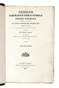 6 volumi in-8° (mm 235x150). Esemplare in barbe, con difetti da controllare. Legatura successiva in mezza pelle, con piatti in carta marmorizzata e titoli in oro al dorso a 4 nervi. Conservati all'interno i piatti delle brossure originali. Lotto non passibile di restituzione. (6) Il VI volume contiene l'Introduzione al dizionario geografico fisico storico della Toscana, il Supplemento al dizionario geografico fisico storico della Toscana e infine l'Appendice al Dizionario geografico fisico storico della Toscana, compilati da Emanuele Repetti e editi a Firenze : Presso l'Autore e editore coi tipi di Mazzoni, 1845-47. Bigazzi, 5698 ; Choix, 1357 ; Platneriana, 391.