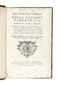 SOLDINI Francesco Maria, Delle eccellenze e grandezze della nazione fiorentina. — Dissertazione storico-filosofica... — Firenze : Nella stamperia Vanni, e Tofani, 1780. — In-8° (mm 207x135).