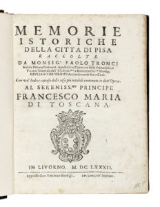 TRONCI Paolo, Memorie istoriche della città di Pisa. — In Livorno : appresso Gio. Vincenzo Bonfigli, 1682. — In-4° (mm 210x160).