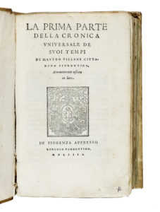 VILLANI Matteo, La Prima parte (-Seconda) della Cronica Universale de suoi tempi. — In Fiorenza : appresso Lorenzo Torrentino, 1554. — 2 parti in 2 volumi in-8° (mm 176x110).